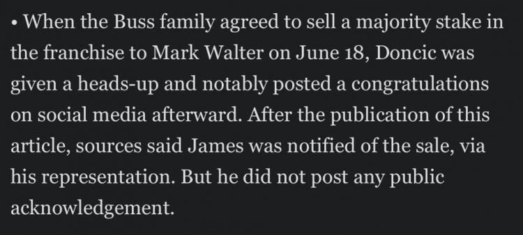根据ESPN名记Ramona Shelburne和Brian Windhorst联合报道,在湖人队将大部分股权出售给马克-沃特斯时,东契奇得到了提前通知,后者也在社媒发布祝贺。